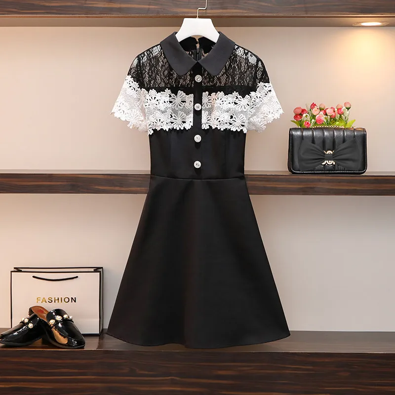 Vestido de encaje de talla grande para mujer, vestido de retazos de manga corta con cuello vuelto con cremallera, ahuecado, novedad de verano de 2021