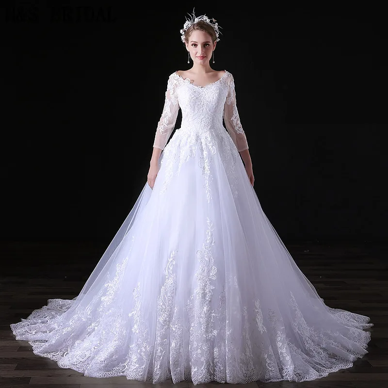 H & S-vestido de novia de encaje de tul, vestidos de boda con velo, manga larga, elegante, para novia, bohemio, 2019